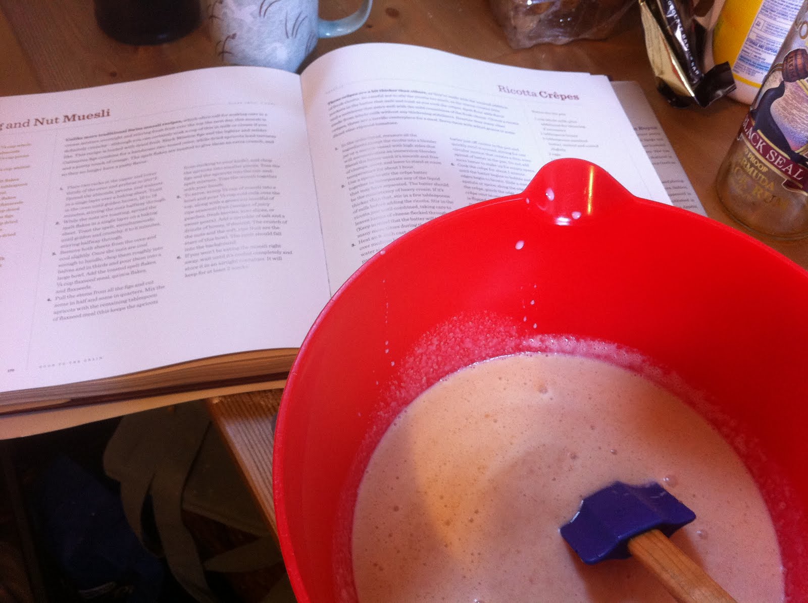 Sometimes I like to make up meanings for the names of ancient grains that have nothing to do with what they actually are. Kamut, for example, is a pet name for a woolly mammoth. Amaranth is either a city in a far off kingdom, or some kind of gem stone (possibly a gem stone named after the far off city in which it's mined). Spelt is probably an onomatopoeia, meaning the sound of expectorating (Spelt! 10 points for Gaston!). In reality, Spelt is a subspecies of wheat popular in the bronze age which is enjoying a new popularity among the health food crowd. Spelt flour acts a lot like wheat flour, though it absorbs more liquid than its more popular counterpart. The flour is sweet, so it is great for baking. And it makes excellent crepes.